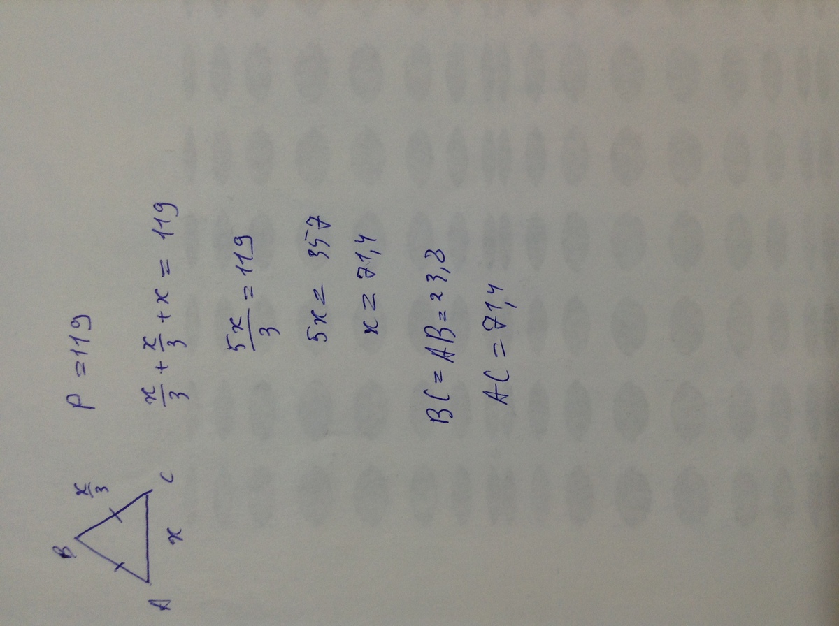 помогите решить задачу.Найдите стороны равнобедренного треугольника,если его периметр равен 119 см,а основание в 3 раза меньше боковой стороны.