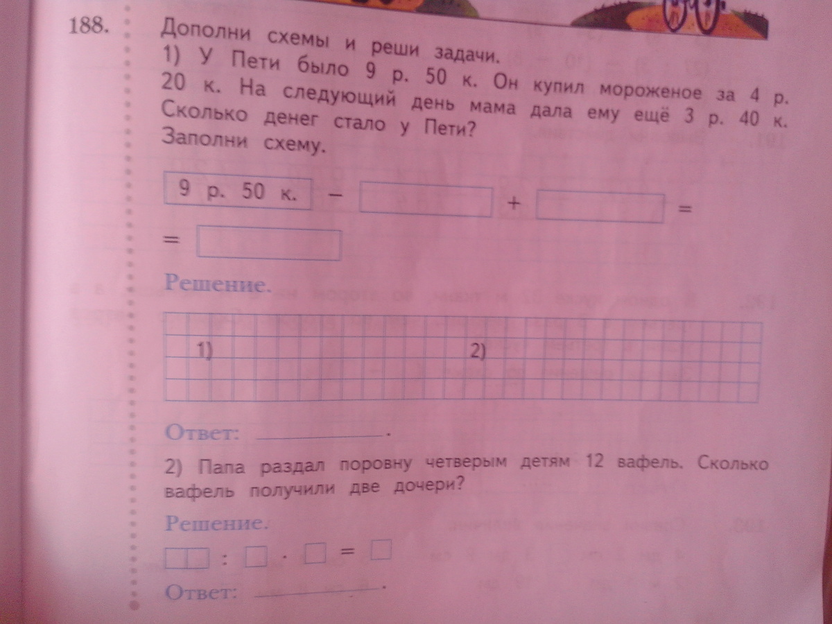 2). 12÷4×2= 6 сёстры получили 6вафель