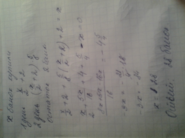 для ремонта школы купили краску.В первый день потратили на 2 банки краски больше.чем половина всей краски,а во второй день 5/8 количества банок краски,потраченной в первый день.После этого осталось 2 банки.Сколько банок купили?