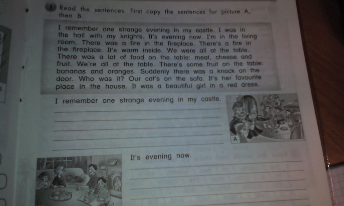 Я помню один странный вечер в моём замке.Я был в хале с личной стражей.Тогда был вечер.Я в зале,огонь полыхал в камине.Внутри было тепло.Мы все сидели за столом.На столе было много еды мясо,сыр и фрукты ... На столе были фрукты:бананы и апельсины.Вдруг кто-то постучался в дверь.Кто же это был?Наш кот был на кресле.Это его самое любимое место в доме.За дверью была красивая девушка в красном одеянии.