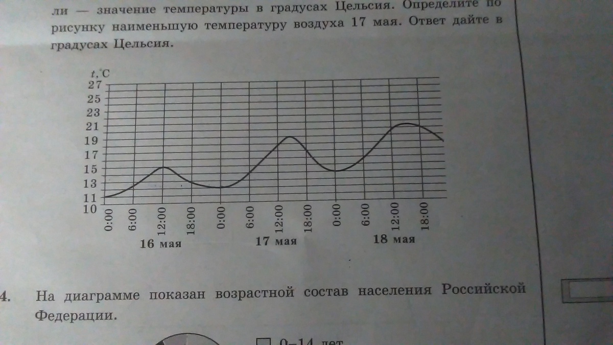 3.На рисунке(ниже)показано изменение воздуха га протяжении трёх суток.По горизонтали указывается дата и время суток, по вертикали -значение температуры воздуха 17 мая.Ответ дайте в градусах Цельсия.