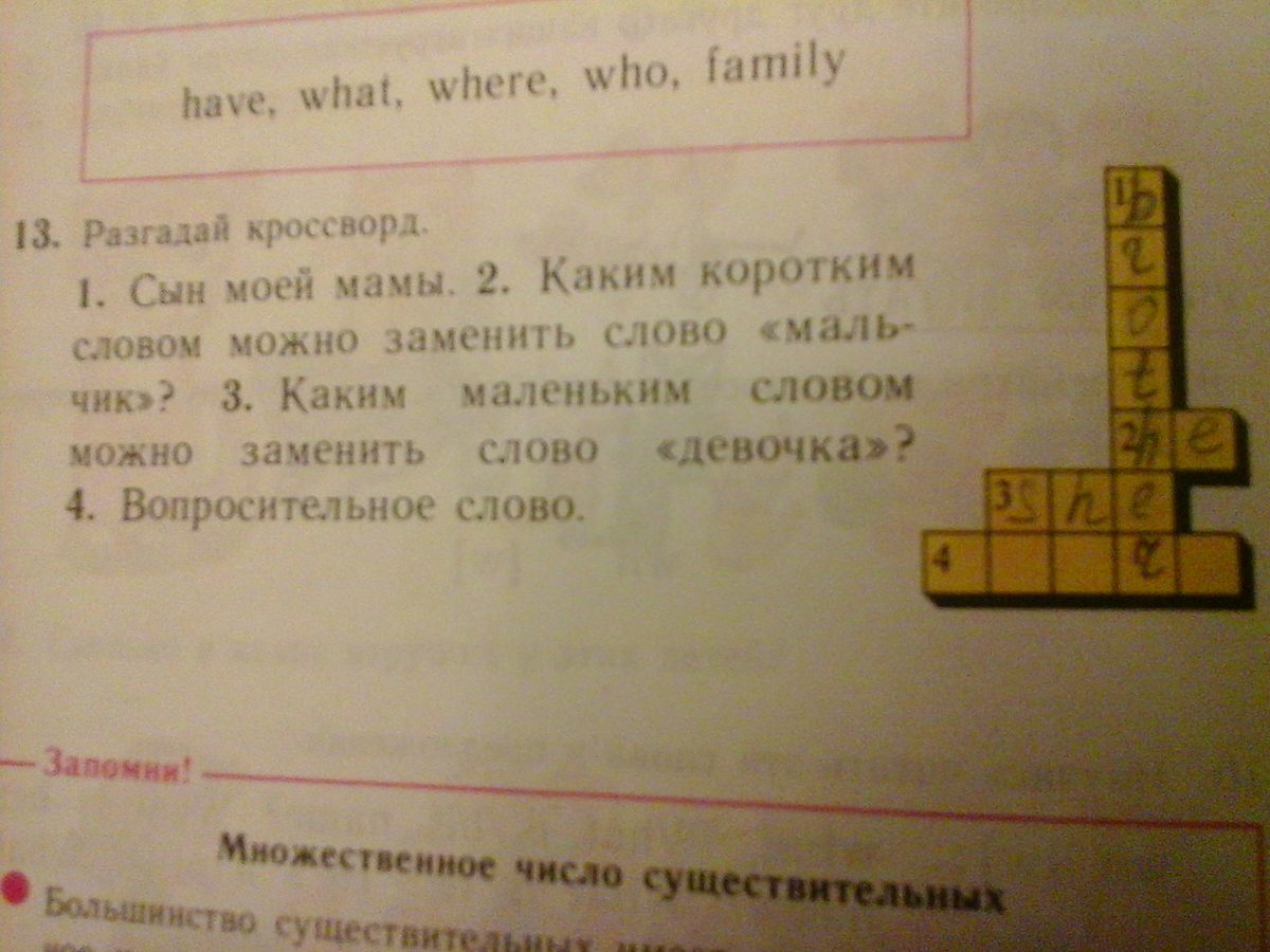 разгадай кроссворд . 1. Сын моей мамы. 2. Каким коротким словом можно заменить слово МАЛЬЧИК. 3. Каким коротким словом можно заменить слово ДЕВОЧКА? 4. Вопросительное слово.
