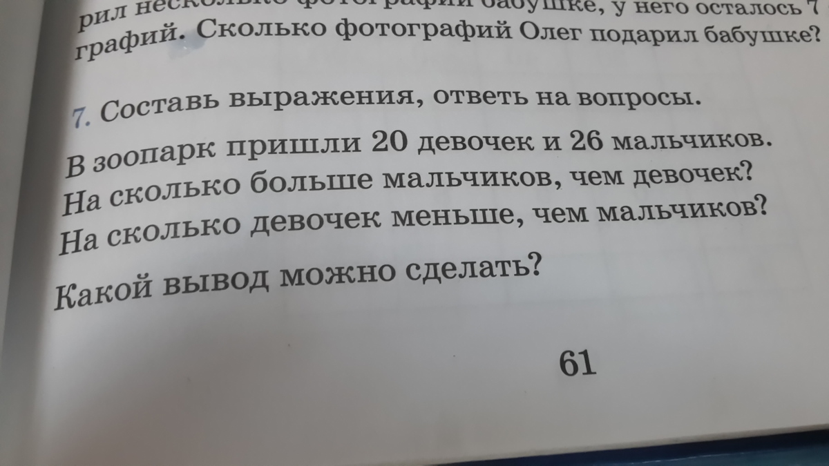 26-20=6т.к.26это мальчика 20девочки а второй наоборот 26-20=6 на 6девочек<чем мальчиков