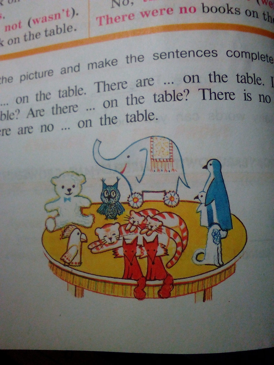 There is a bear on the table. There are two cats on the table. Is there a dog on the table ? Are there any foxes on the table? There is no giraffe on the table.