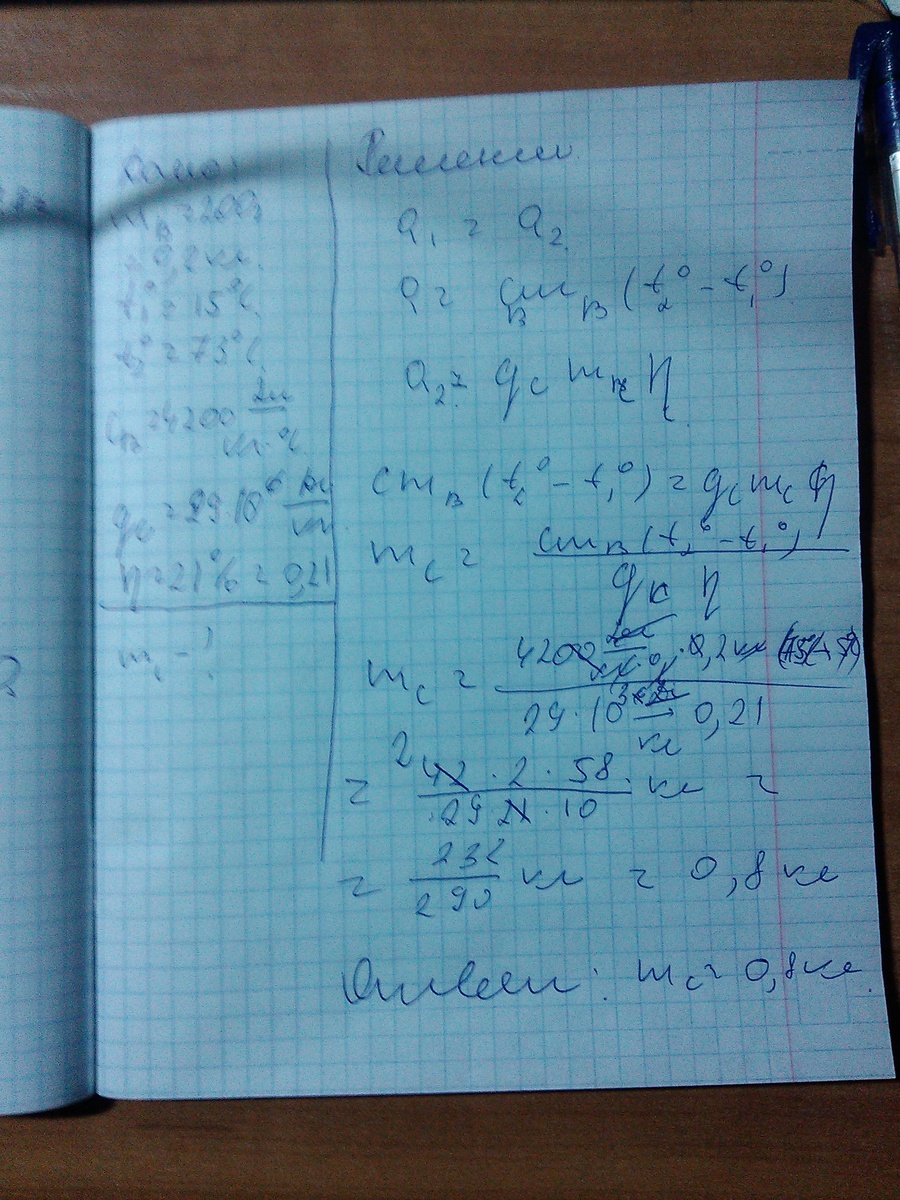 На спиртовке нагрели 200 г воды от 15C до 73C. Какая масса спирта была потрачена на нагревание воды? КПД = 21%, c воды = 4200 дж/кгС, q спирта = 29 х 10(в