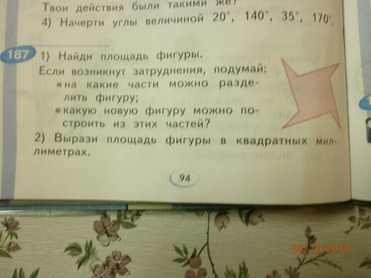 Аргинская 3 класс 1 часть № 187.Подскажите, пожалуйста, как найти площадь этой фигуры. С прямоугольниками справляемся,а здесь никак не сообразим с чего начать.