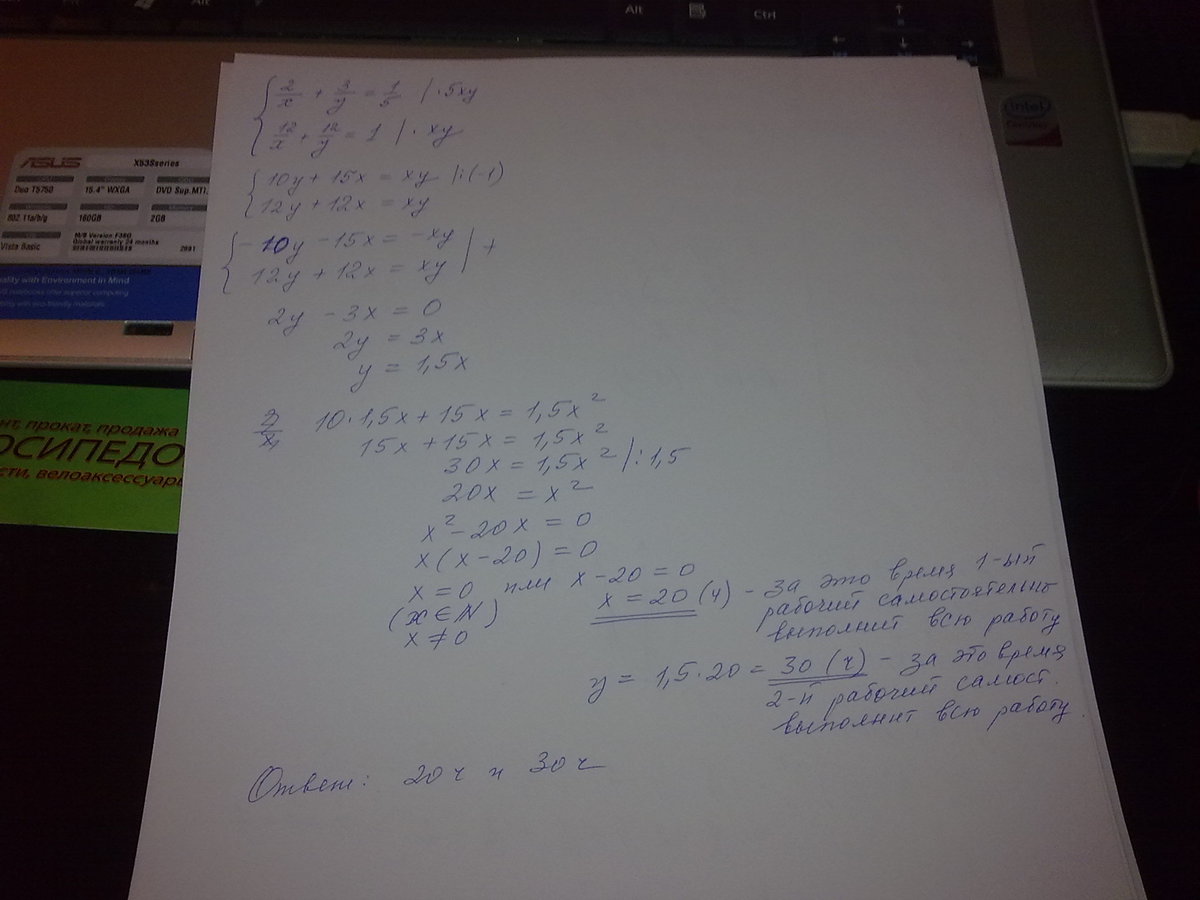 Двое рабочих,работая вместе,могут выложить плиткой дорожку вокруг фонтана за 12 ч.Если первый рабочий будет работать только 2ч,а второй - 3ч,то плиткой будет уложена только пятая часть площади дорожки.За какое время может выложить плиткой всю площадь дорожки каждый рабочий,работая отдельно?