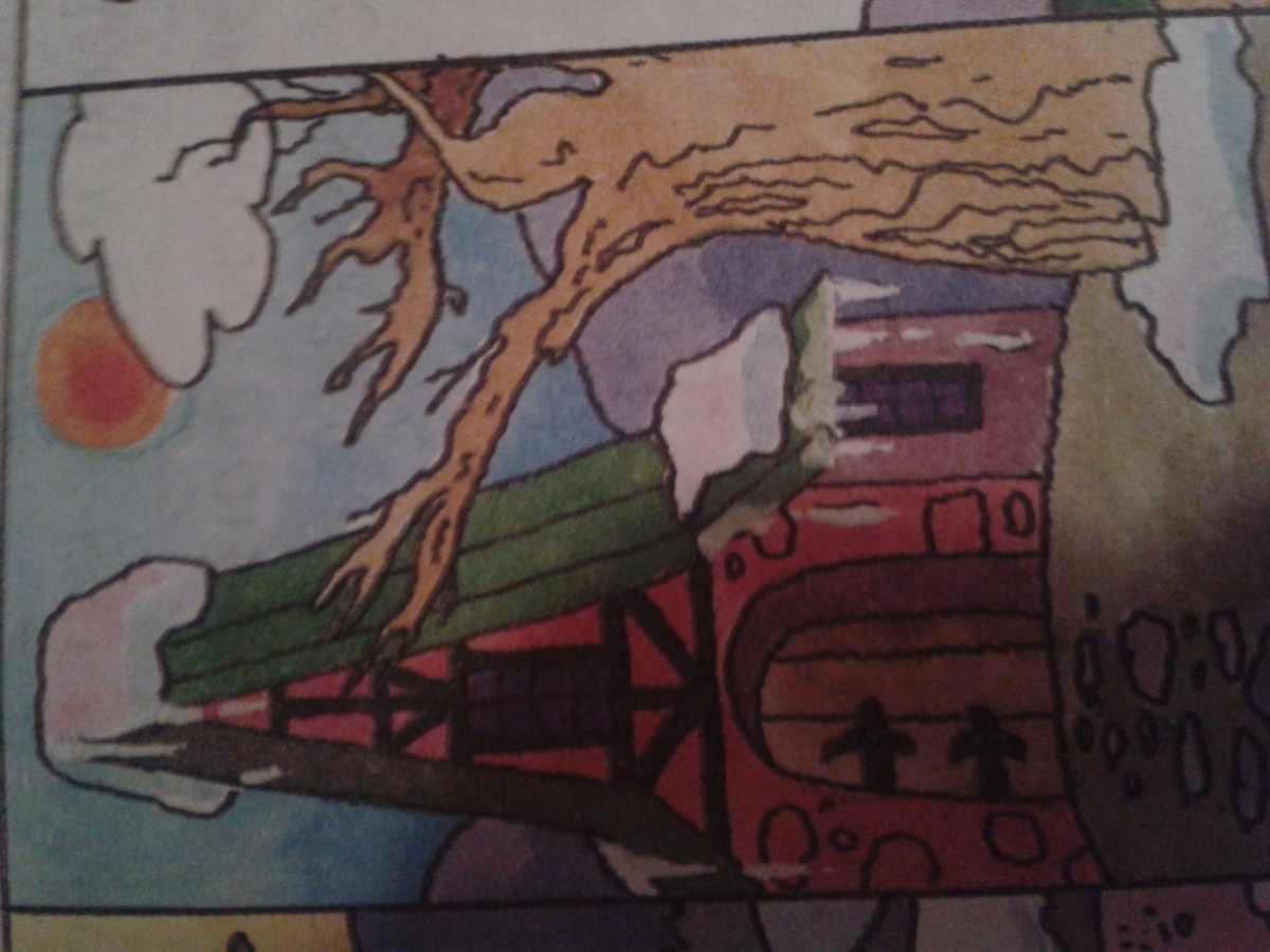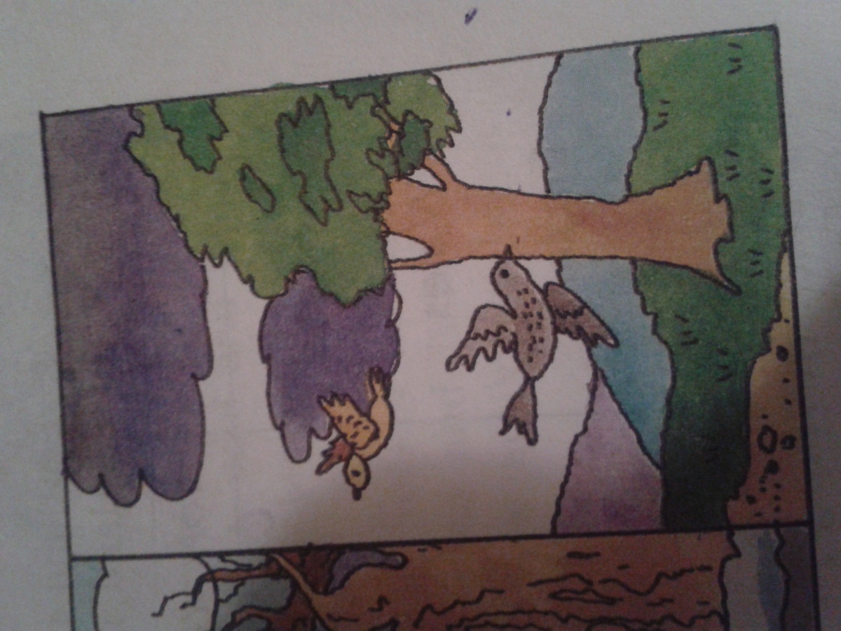 На второй картине изображено дерево и две птицы, летающие вокруг него. Дует сильный ветер, дерево качает из стороны в сторону. Серые облака - это означает, что скоро будет дождь. Бедные птицы не знают, куда им спрятаться, чтобы переждать дождь. Они летали и искали надежное место.