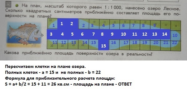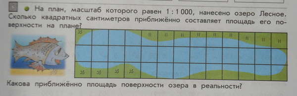 На план, масштаб которого равен 1:1000, нанесено озеро Лесное. Сколько квадратных сантиметров приближенно составляет площадь его поверхности на плане? Какова приближенно площадь поверхности озера в реальности?