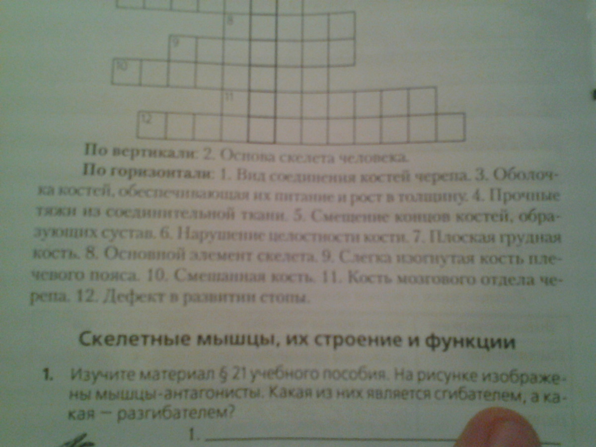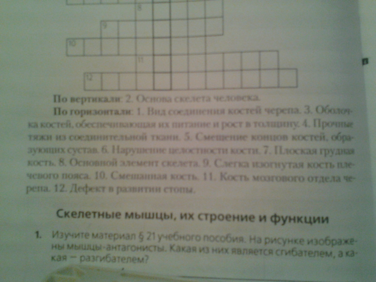 По горизонтали. 1. Неподвижное. 3. Надкостница. 4. Связки. 5. Вывих. 6. Перелом. 7. Грудина. 8. Кость.9. Ключица. 10. Поясничный. 11. Височная. 12. Плоскостопие.