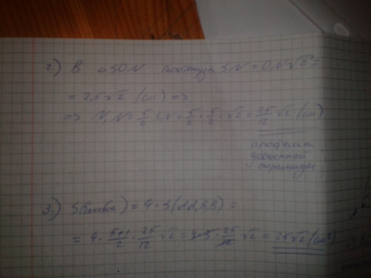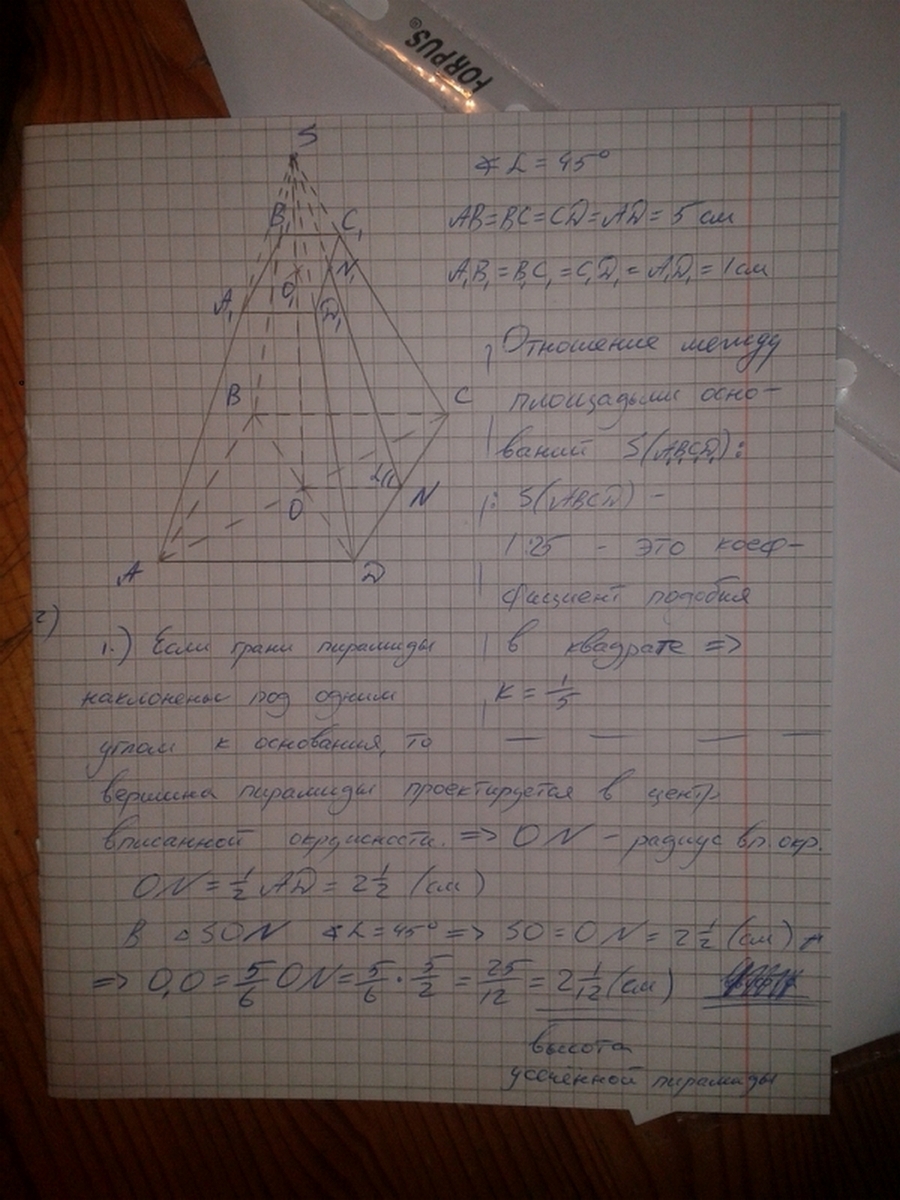 Ребра оснований правильной четырехугольной усеченной пирамиды 1 см. и 5 см., а боковое ребро усеченной пирамиды 2 см., Боковая грань образует угол 45 градусов с плоскостью основания. Найдите апофему усеченной пирамиды, высоту усеченной пирамиды и Sбок.?