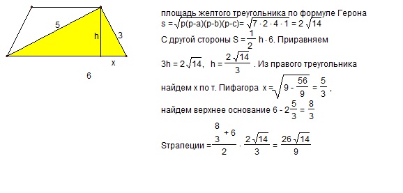 Использована формула площади треугольника через высоту и формула Герона, теорема Пифагора, свойства равнобедренной трапеции, формула площади трапеции