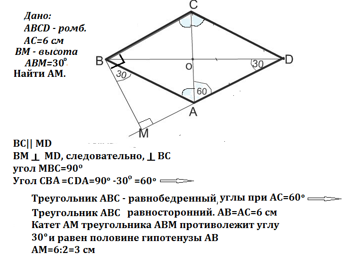 Высота BM,проведенная из вершины угла ромба ABCD образует со стороной AB угол 30 градусов, длина диагонали AC равна 6 см . НАЙДИТЕ АМ ЕСЛИ ТОЧКА М ЛЕЖИТ НА ПРОДОЛЖЕНИИ СТОРОНЫ AD