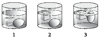 Учитель на уроке последовательно опустил в три разные жидкости сплошной кубик изо льда и сырое яйцо