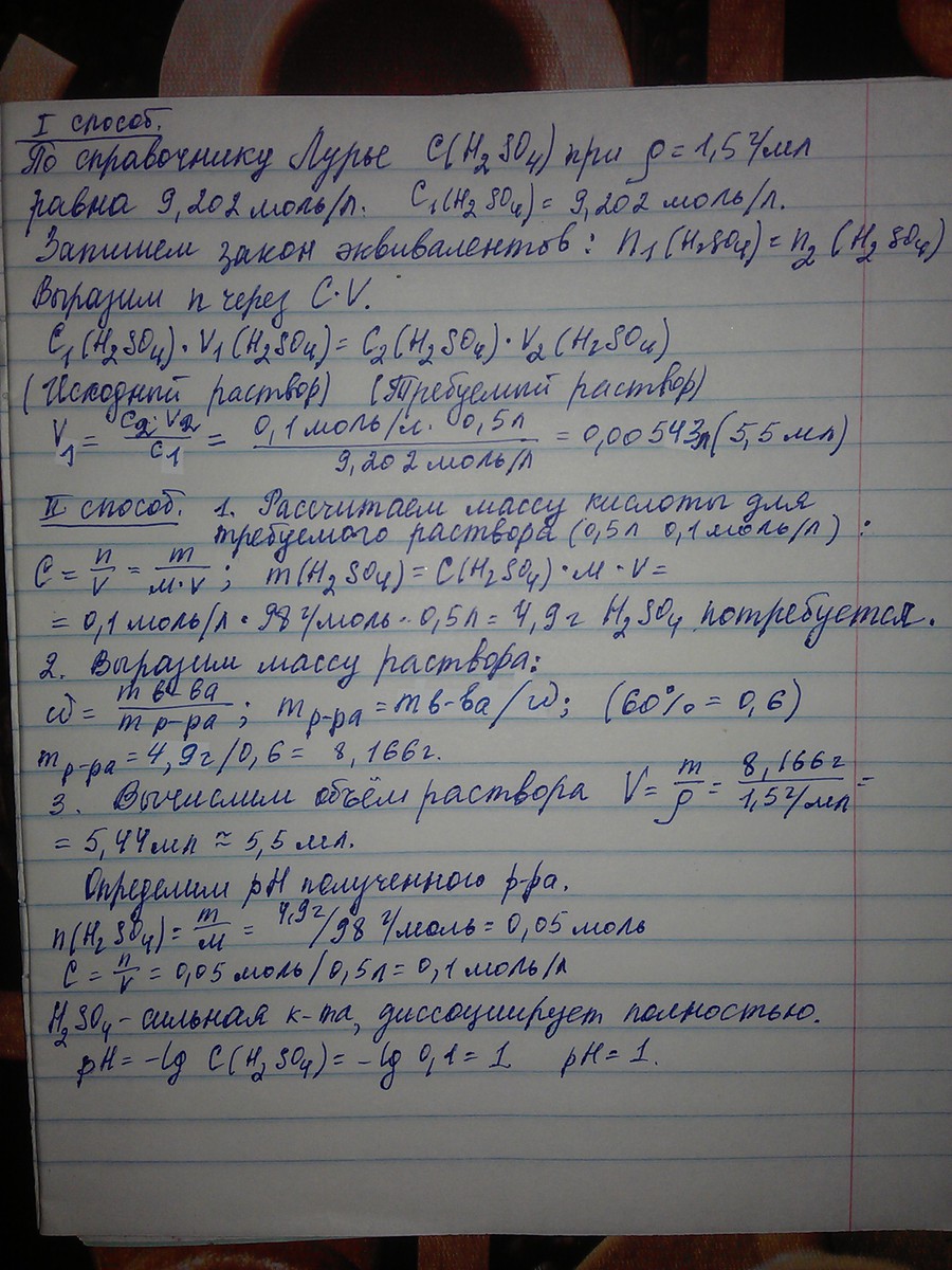 Какой объем 60% серной кислоты с плотностью 1,5 г/мл потребуется для приготовления 0,5 л раствора серной кислоты с концентрацией 0,1 моль/л? Рассчитайте pH полученного раствора