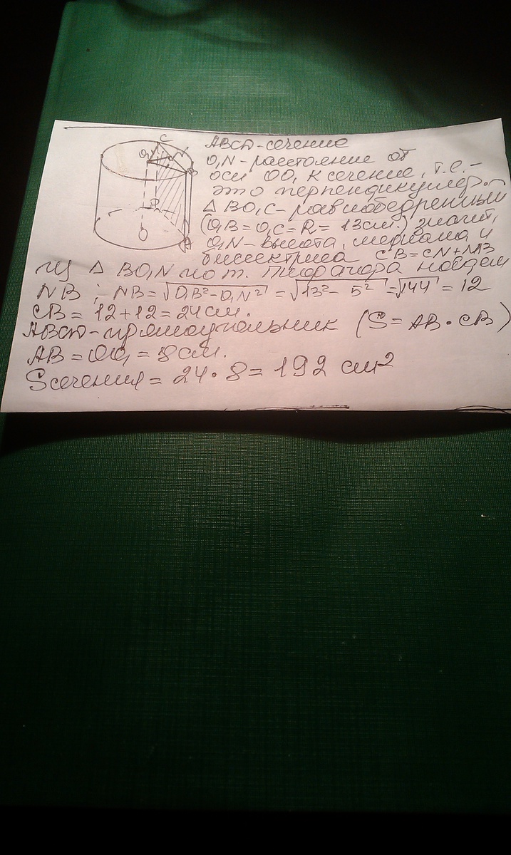 Висота циліндра дорівнює 8 см, а радіус основи 13 см. На відстані 5 см від осі циліндра проведено переріз, який паралельний осі циліндра. Знайти площу перерізу.