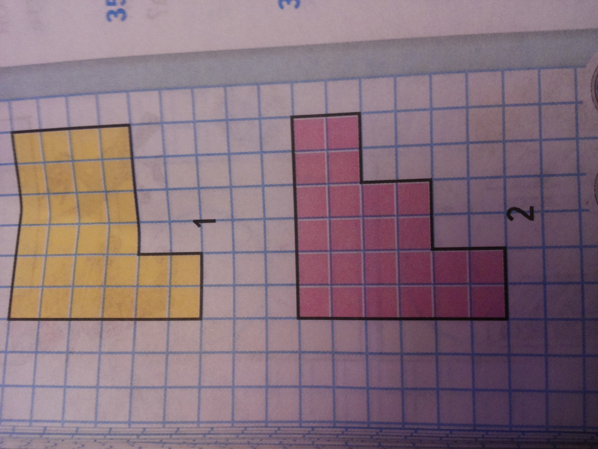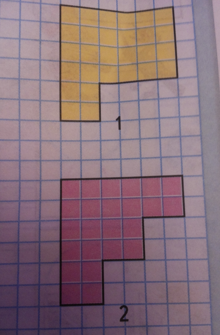 2) Площадь 1-й фигуры Пл1=(6×4)+(2×2)=28 единиц, площадь 2-й фигуры Пл2=(2×6)+(2×4)+(2×2)=24 единицы, т.о. Пл1 больше Пл2 на 4 единицы.