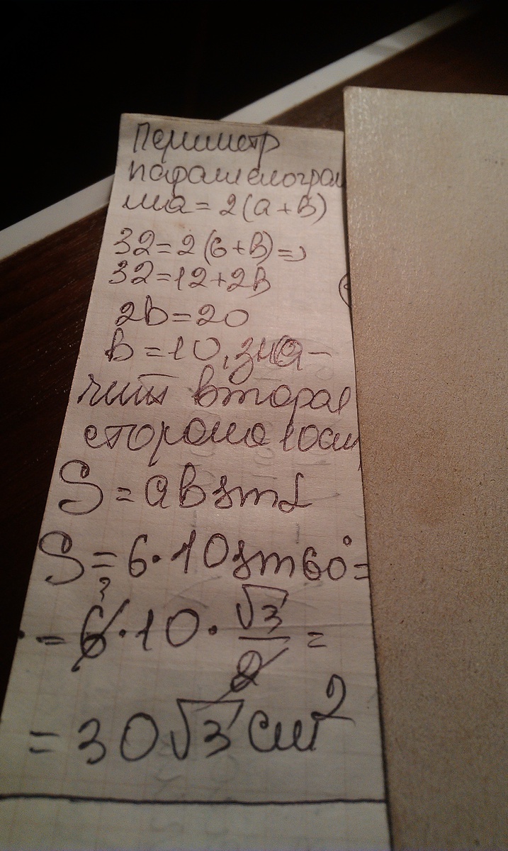 периметр параллелограмма равен 32 см. найти площадь параллелограмма, если один из его углов 60°, а одна из сторон 6 см. Помогите пожалуйста