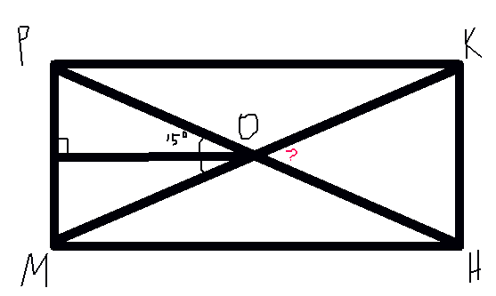 В прямоугольнике MPKH диагонали пересекаются в точке O. Отрезок OA является высотой треугольника MOP, угол AOP= 15 градусов. Чему равен угол OHK? Пожалуйста решитеее)