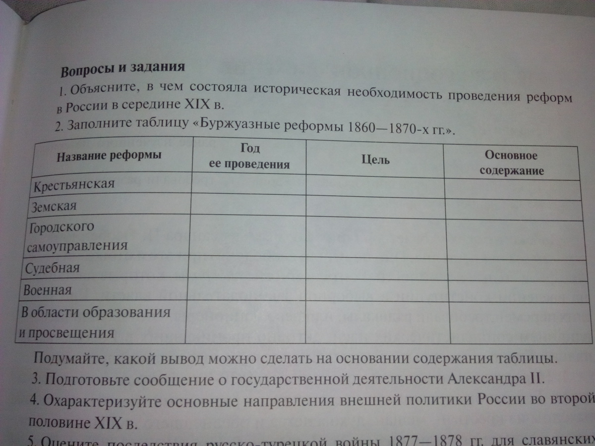 Буржуазные реформы 1860–1870х гг.Отмена крепостного права потребовала проведения и других преобразований, которые должны были приспособить жизнь страны к новым условиям капитализма. Земская реформа 1864 г. вводила в губерниях и уездах местное самоуправление: земские собрания и их исполнительные органы – земские управы. В них избирались дворяне, сельская интеллигенция, буржуазия, богатые крестьяне. Земства не имели политических прав, занимались решением местных проблем (борьба с эпидемиями, открытие медпунктов, школ, дорог, землеустройство и др.). Судебная реформа 1864 г. установила гласный бессословный суд с участием присяжных заседателей, состязательность сторон в ходе судебного процесса (введена защита – адвокатура), независимость суда от администрации. Был создан нотариат по ведению наследственных дел, удостоверению сделок, документов. Городская реформа 1870 г. создавала городское самоуправление: городскую думу и управу, решавшие коммунальные вопросы (борьба с пожарами, контроль за санитарным состоянием, проблемы больниц, школ, приютов и др.) В думу избирались, как правило, самые зажиточные горожане, во главе думы и управы стоял городской голова. Военная реформа 1874 г. заменила рекрутские наборы всеобщей воинской обязанностью. Все мужское население, достигшее 21 года, подлежало призыву на военную службу. Сроки ставились в зависимость от образования: от 6 месяцев до 6–7 лет. Улучшилась подготовка офицеров, проведено перевооружение армии. Реформа просвещения. С 1863 г. введен университетский устав, утвердивший определенную автономию и демократизм этих учебных заведений. Школьный устав 1864 г. давал формальное равенство в обучении, расширял сеть школ. В 1870 г. стали открываться женские гимназии, появились высшие женские курсы. Реформа печати. В 1865 г. для столичных изданий отменялась предварительная цензура. Преобразования затронули также сферу финансов, положение православного духовенства, духовные учебные заведения. По отношению к иноверию и религиозному инакомыслию правительство в целом придерживалось начал веротерпимости. «Великие реформы» 1860–1870х гг. способствовали превращению России в буржуазную монархию, но носили половинчатый характер и закрепляли пережитки феодализма