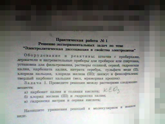 №1 Проведите реакции между растворами следующих веществ: 1)карбонат калия и соляная кислота; 2)хлорид железа(3) и гидроксид калия 3) гидроксид натрия и серная кислота;Напишите уравнения реакций в молекулярном и ионном виде.