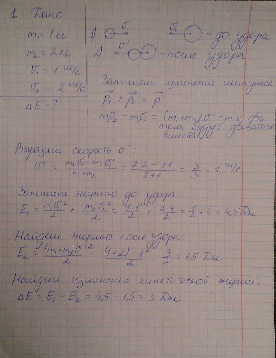 1.Неупругие шары массами 1 кг и 2 кг движутся навстречу друг другу со скоростями соответственно равными 1 м/с и 2 м/с. Найдите изменение кинетической энергии системы после удара.
