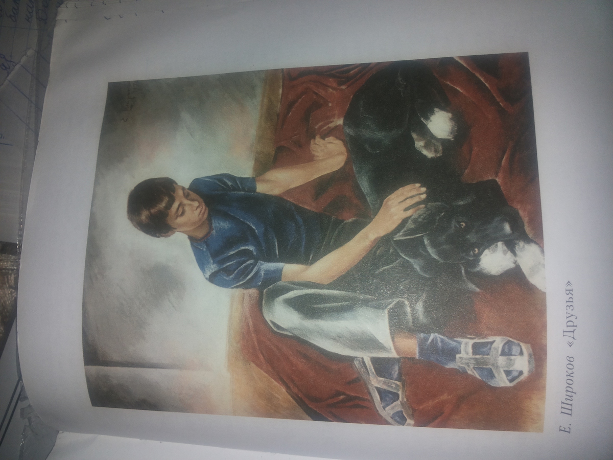 Евгений Николаевич Широков известный российский художник-портретист. Его кистью написано множество картин с изображением известных личностей того времени – середины двадцатого века. Одной из известнейших работ автора является картина «Друзья». На этом полотне изображен мальчик и собака. В центре картины расположен мальчик, который одет в синюю футболку, серые брюки, синие носки и серые сандалии. Он сидит на красной подстилке возле собаки и одной рукой очень бережно гладит ее. Из картины видно, что их отношения очень теплые, нежные и дружеские.Собака (похоже, что это дог) лежит рядом на той же подстилке. У нее очень красивая угольно-черная шерсть, отливающая бликами здоровья и хорошего ухода хозяином. И только лапки у нее очень забавные, будто одеты в белые носочки. Центр переднего плана картины занимает ее милая мордашка, открытые добрые глаза выражают глубокое понимание своего друга. А одно ухо приподнято, как будто он очень внимательно слушает, стараясь не пропустить ни одного слова своего юного хозяина. Они оба грустят. Но из этой картины видно, что у собаки все в порядке, в ее глазах читается понимание друга и сопереживание его проблемам. Сочувствие – великое качество, присущее настоящей дружбе.На лице мальчика изображена грусть, он что-то рассказывает своему другу, глаза опущены и кажется, вот-вот пойдут слезы. А губы его слегка надуты, это говорит о том, что мальчика кто-то обидел. Возможно, в школе учительница незаслуженно его поругала. А может дома получил от родителей за какой-то проступок. С картины видно, что верный друг мальчика умеет его поддержать и выслушать в нужный момент.Задний план картины размытый, там нет ничего. Автор тем самым показал, что в такие моменты сопереживания и взаимопонимания между друзьями нет ничего вокруг более важного, чем всецело поддержать лучшего друга. Картина написана очень чувственно и проникновенно. Она очень ярко передает теплоту взаимоотношений между верными друзьями. Раскрывает внутреннюю глубину понимания друг друга и располагает к открытости и бескорыстию взаимоотношений между друзьями.