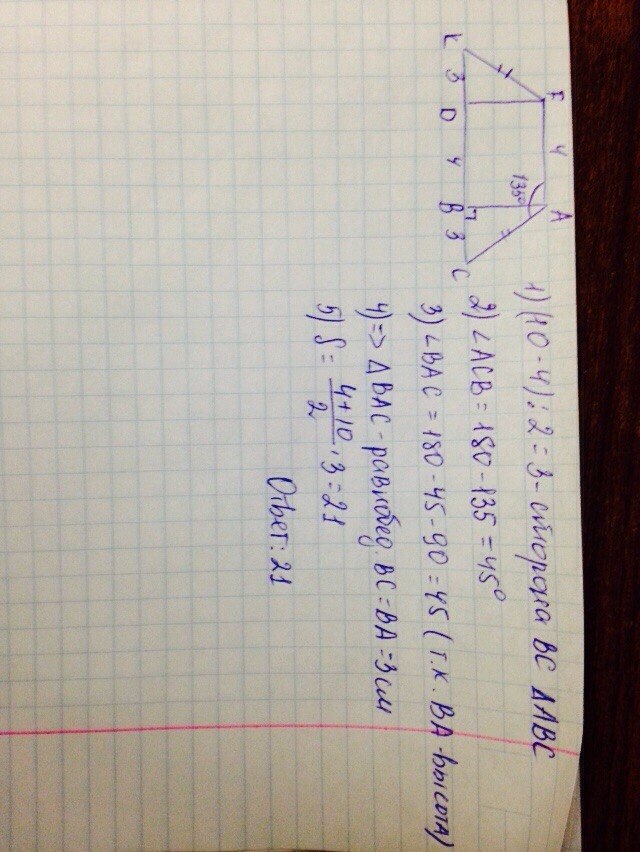Тупой угол равнобедренной трапеции равен 135 градусам, а ее основания равны 10 см. и 4 см. Найдите площадь этой трапеции.
