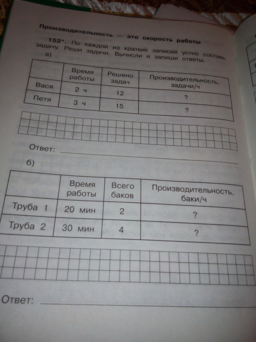 а) Вася работал 2 часа и решил 12 задач, а Петя работал 3 часа и решил 15 задач. Какова их производительность?