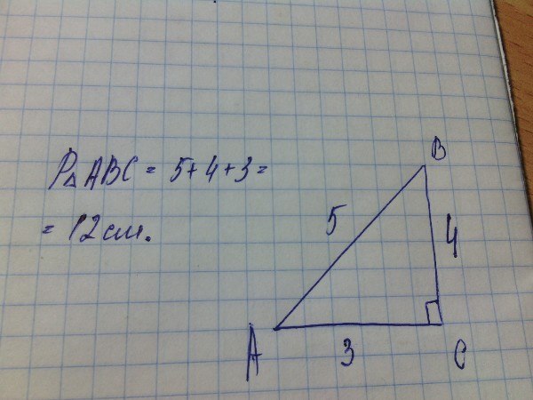 В треугольнике АВС угол С=90 градусам. Длина перпендикуляра, проведенного из точки А к прямой ВС, равна 3 см, а из точки В к прямой АC 4 см. Найдите периме