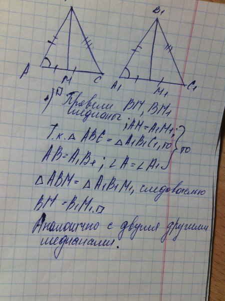Как доказать, что медианы равных треугольников, проведенные к соответственным сторонам этих треугольников, равны между собой