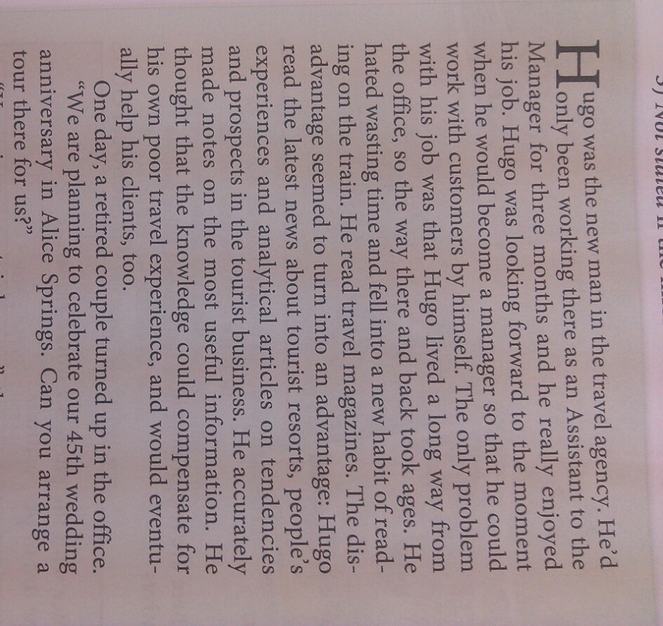 Хьюго новый человек в турфирме. Он только работает там в качестве помощника менеджера в течение трех месяцев, и он действительно наслаждался своей работой. Уго нетерпением жду того момента, когда он станет менеджером, чтобы он мог работать с клиентами по себе единственная проблема с его работой, что Уго жил долгий путь от офиса, так туда и обратно взяло возрасты. Он ненавидел тратить время и упал в новую привычку чтении на поезде. Он читал туристических журналах. Недостатком казалось превратить в преимущество: Hugo прочитать последние новости о туристических курортов, опыт людей и аналитических статей о тенденциях и перспективах в туристическом бизнесе. Он точно записывал на самом полезной информации. Он думал, что знание может компенсировать своей плохой опыт путешествий, и в конечном итоге помочь своим клиентам, тоже. Однажды, в отставке пара оказалась в офисе. "Мы планируем праздновать нашу 45-ую годовщину свадьбы в Алис-Спрингс. Вы можете устроить экскурсию там для нас?"