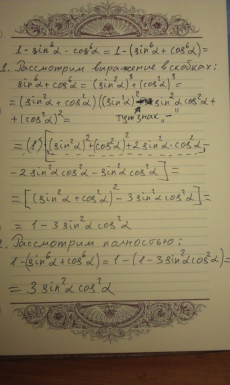 1-(sin^6a+cos^6a)=1-(sin^2a+cos^2a)(sin^4a+cos^4a-sin^2acos^2a)=