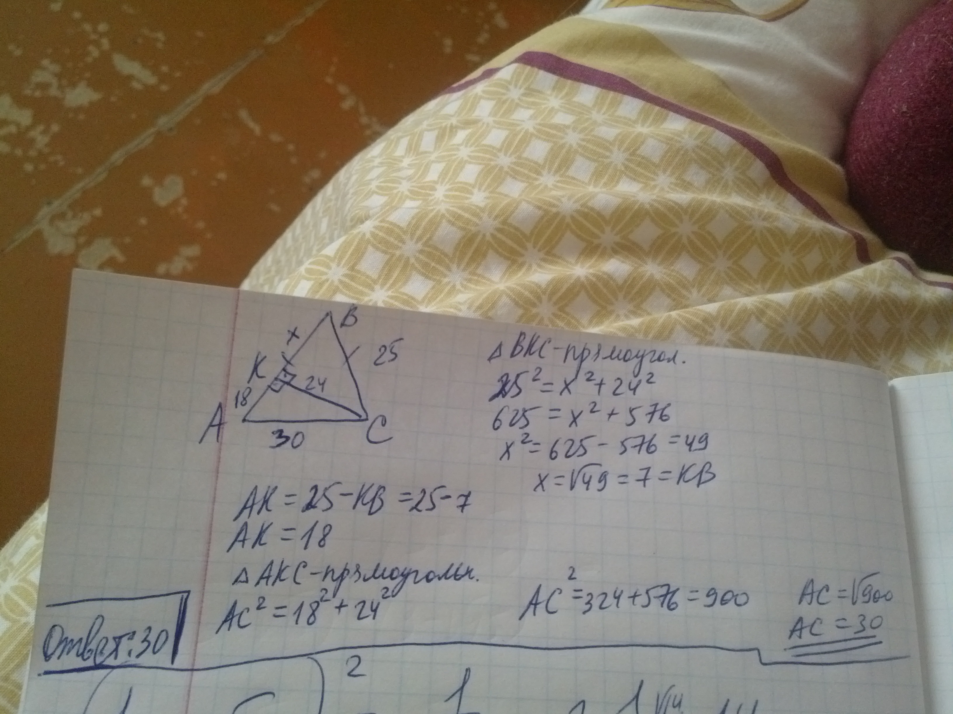 В равнобедренном треугольнике АВС (основание АС) боковая сторона равна 25 см, а высота СК равна 24 см. Найдите основание.