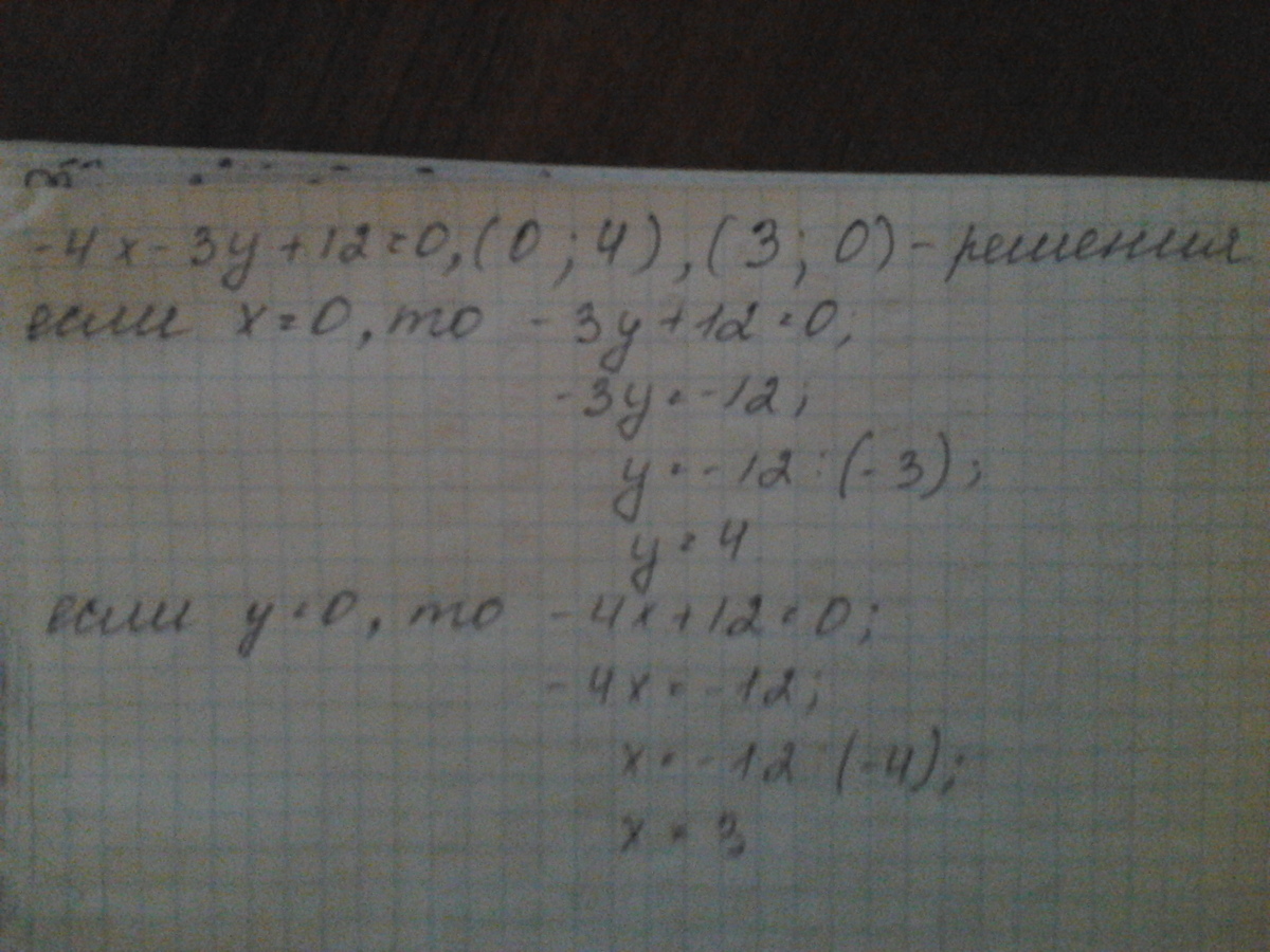 Найдите координаты точек пересечения графика линейного уравнения -4x - 3y + 12 = 0 с осями коорднат