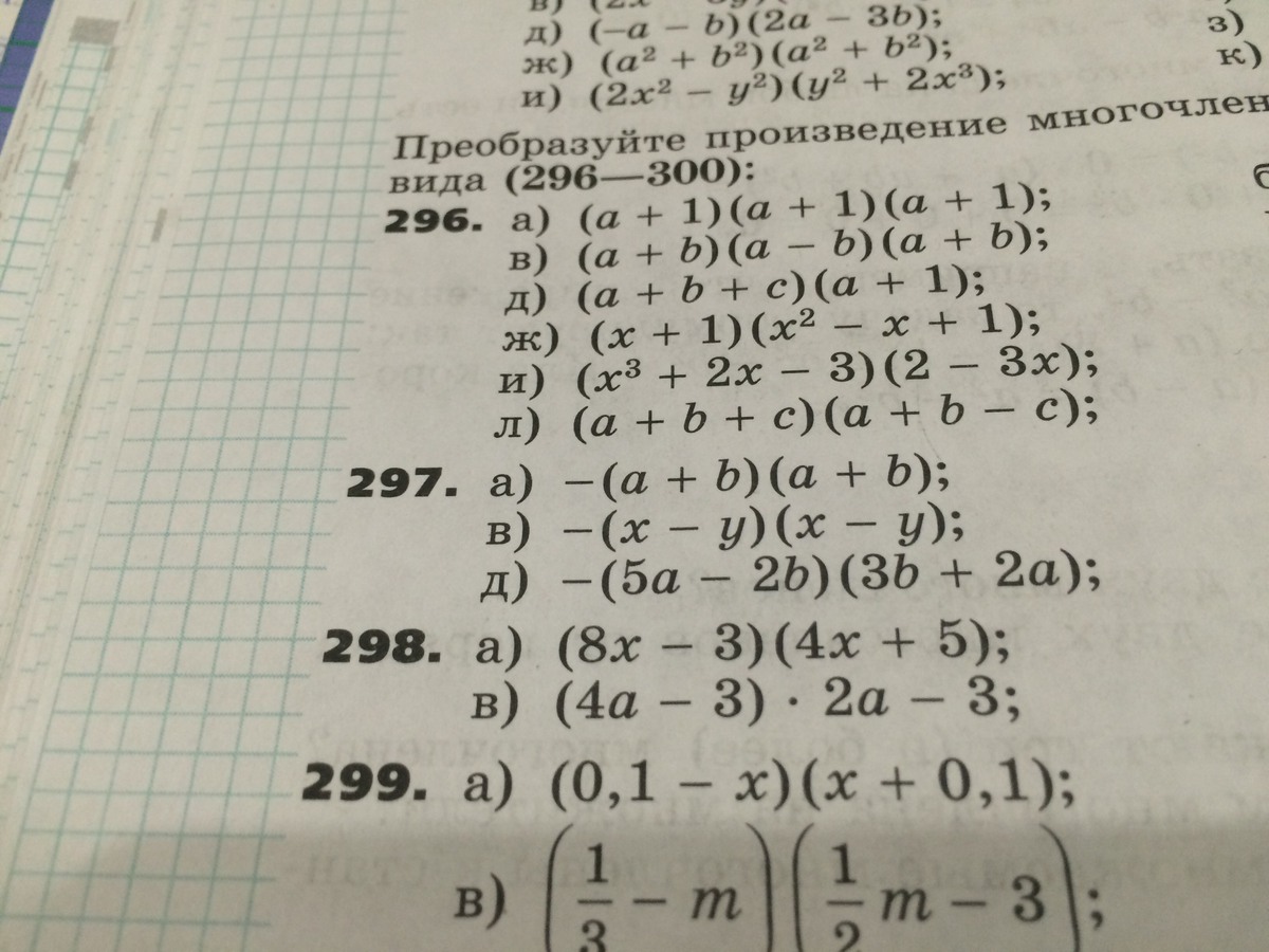 297а)-(а+b)(a+b)=-(a+b)^2=-a^2-2ab-b^2в) -(x-y)(x-y)=-(x-y)^2=-x^2+2xy-y^2д) -(5a-2b)(3b+2a)=-(15ab+10a^2-6b^2-2ab)=-13ab-10a^2+6b^2Примечание: ^2 - выражение в квадрате