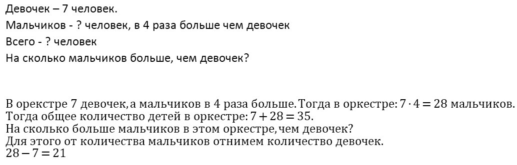 Как сделать задачу? В школьном оркестре 7 девочек,а мальчиков в 4 раза больше, чем девочек.Сколько всего детей в школьном оркестре? На сколько больше мальчиков в этом оркестре,чем девочек? Только краткую запись