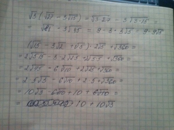 Вы знаете,всё вроде правильно,я тоже так решала,но в ответе первого примера получается такой ответ:9 умножить на выражение в скобках( один минус квадратный корень из пяти). А во втором должен быть такой ответ:10 умножить на выражение в скобках(квадратный корень из 3 +1)