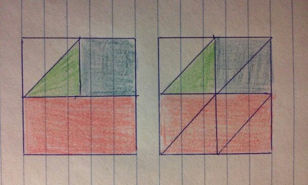 драта и закрась один из них синим цветом. другой квадрат раздели на 2 треугольника и закрась один зелен. цветом. вопрос: какая доля большого квадрата осталась незакрашенной?