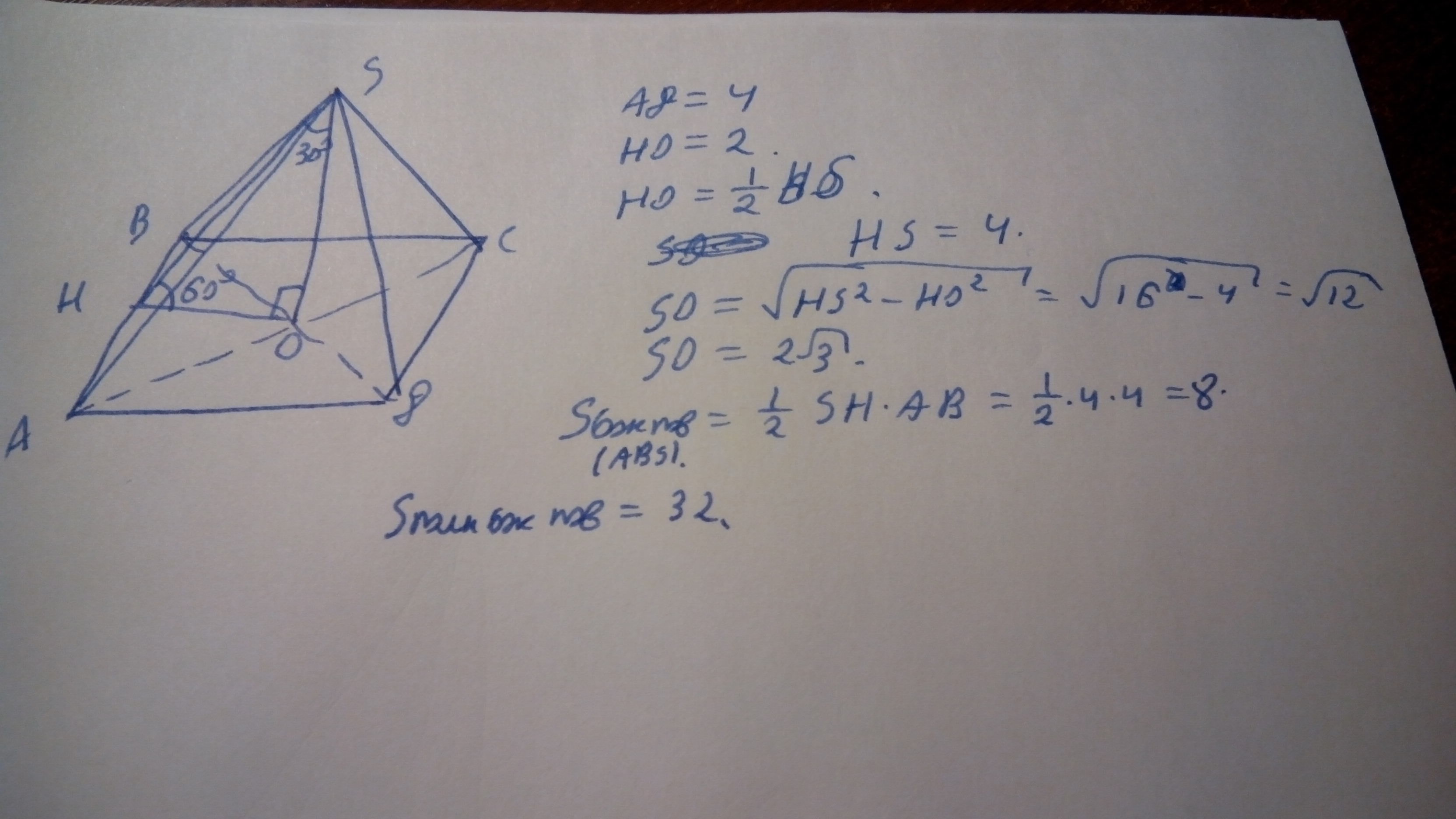 сторона основания правильной четырехугольной пирамиды равна 4см,а апофема образует с плоскольтью угол 60 гадусов. Найдите:
