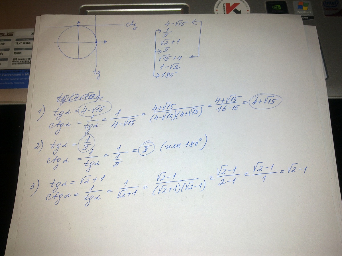 из чисел 4- корень из 15 , 1/пи, корень из 2 +1, пи, корень из 15 +4, 1- корень из 2, 180. составьте все пары из которых соответствует значениям tga и сtga некоторого числа а. ответ поясните