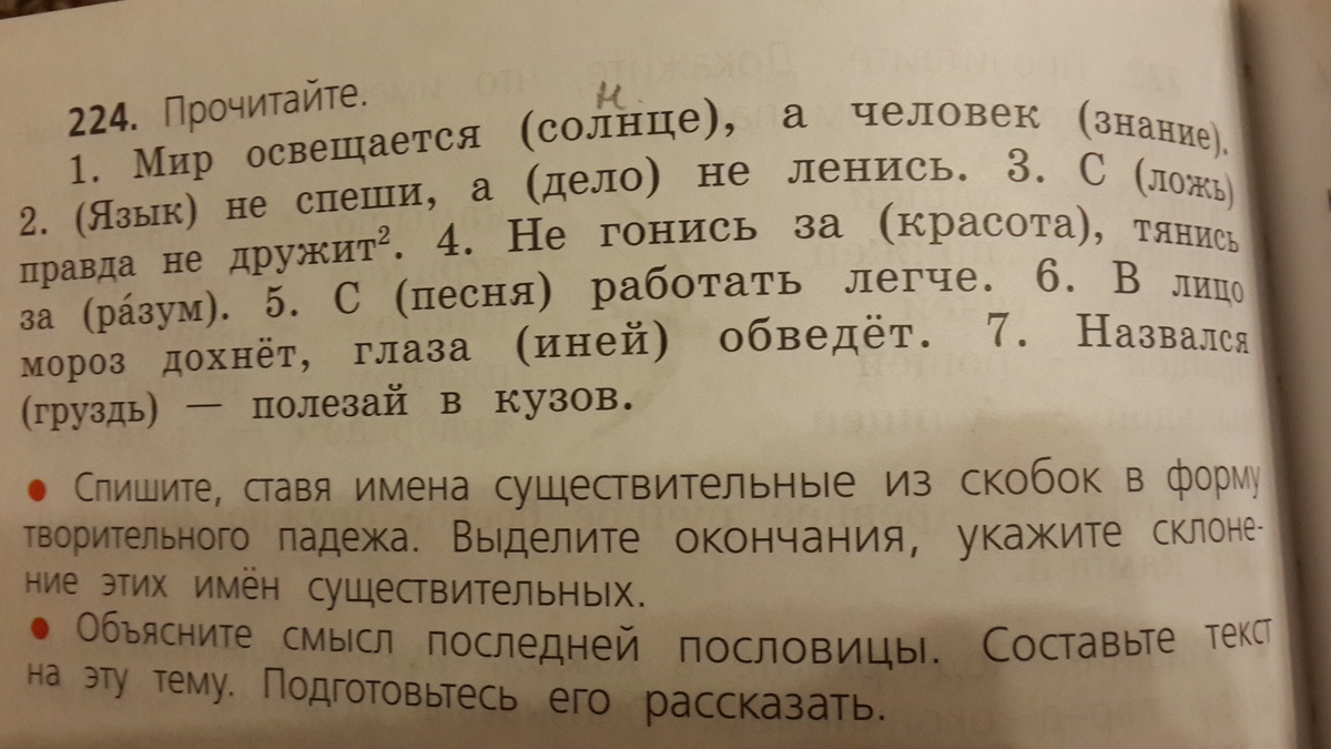 Мир освещается солнцем,а человек знанием.Языком не спеши,а делом не ленись.С ложью правда не дружит.Не гонись за красотой, гонись за разумом. С песней работать легче.В лицо Мороз дохнёт,глаза Инеем обведёт. Назвался груздем-полезай в кузов. Ещё что-то надо?