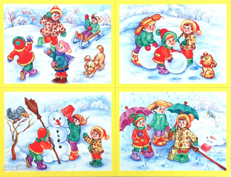 Дети играли в снежки катались на санках.Потом они слепили снежную бабу с веником и ведром.Но вот пришла весна и снеговик растаял.