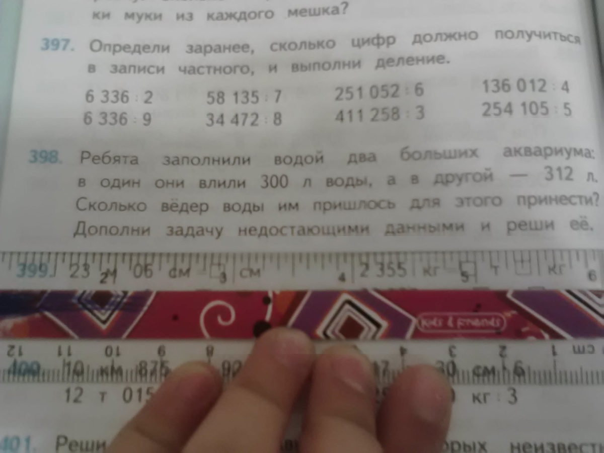 Можно в недостающие данные - в первый аквариум принесли на одно ведро меньше, чем во второй аквариум, тогда доп. действие 312-300=12 л вместимость ведра.