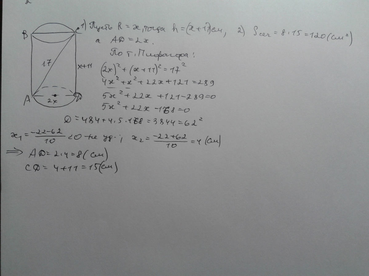 діагональ осьового перерізу циліндра 17 см.Висота на 11 см більша радіуса. знайти S осьвого перерізу