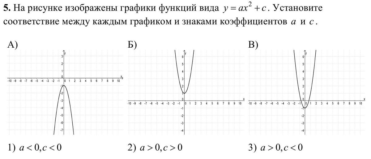 А. 1) (при а < 0 ветви параболы всегда направлены вниз. Чтобы определить с, надо подставить в у=ах²+с х=0⇒ у=0*0² + с ⇒ у=с. Так как на графике при х=0 у<0, то с<0)