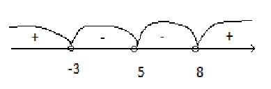 2) выкалываем на числовой оси точки, которые обращают левую часть неравенства в ноль. Х1=-3; Х2=5; Х3=8. Расставляем знаки на получившихся промежутках (см. рисунок 3). Т.к. в неравенстве знак "меньше", выбираем промежутки с "минусом".