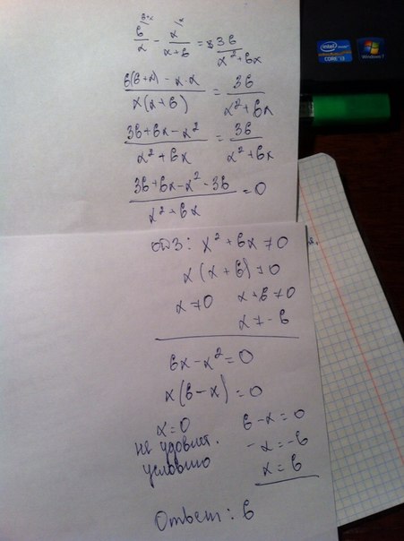 6 деленное на x (в дроби) минус x деленное на x плюс 6 И всё это = 36 деленное на x(2 степень)плюс 6x
