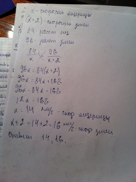 За одно и тоже время ящерица проползла 84 м. , а змея-96м , при этом скорость змеи на 2м/мин. больше скорости ящерицы. Найдите скорость (м/мин) каждого животного.
