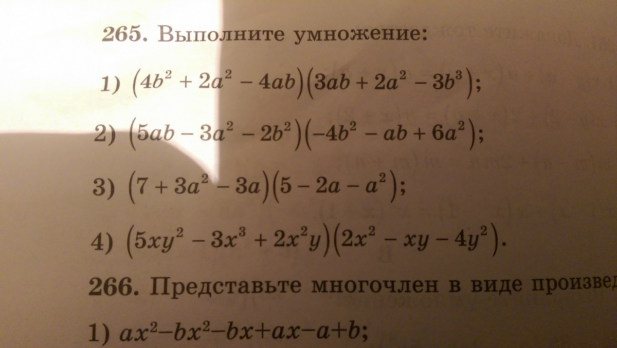 1) (4b^2+ 2a^2- 4ab)(3ab+2a^2-3b^2) = 12ab^3 + 6a^3b - 12a^2b^2 + 8a^2b^2+4a^4-8a^3b-12b^4+12ab^3 = 4a^4 - 12b^4 - 10a^2b^2 - 2a^3b +12ab^3